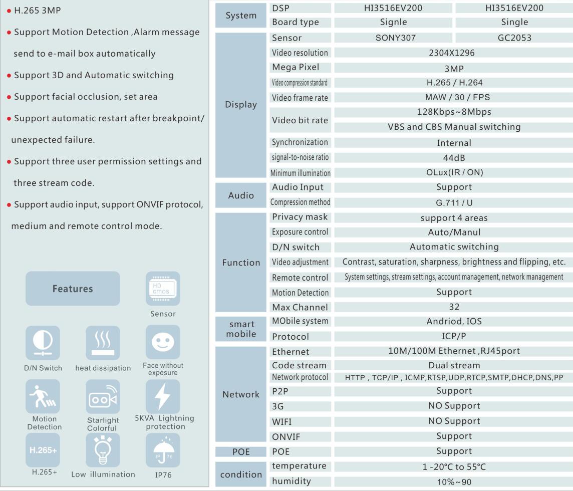 Hisilicon 3MP chipset, Hi3516EV200+SONY307, H 265+,6 array warm LEDS,Intelligent graded dimming,F1 4 HD lens,metal front cover, plastic body